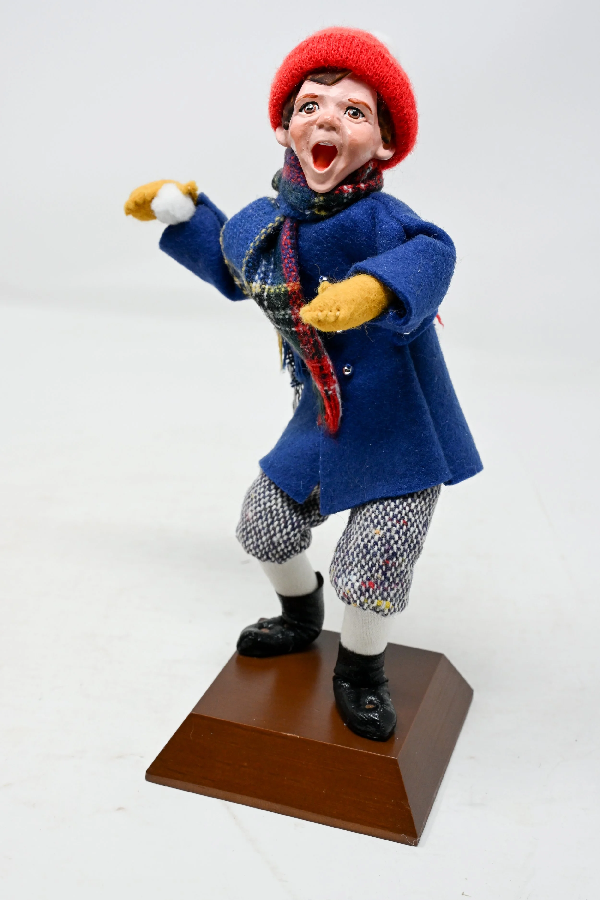 Snowball Boy was the last of the original seven to be designed, added in the late 1950s to inject a note of mischief into the otherwise perfectly composed group. His arm raised, snowball at the ready, he's been threatening to disrupt the caroling for over sixty years — and the set would be incomplete without him.