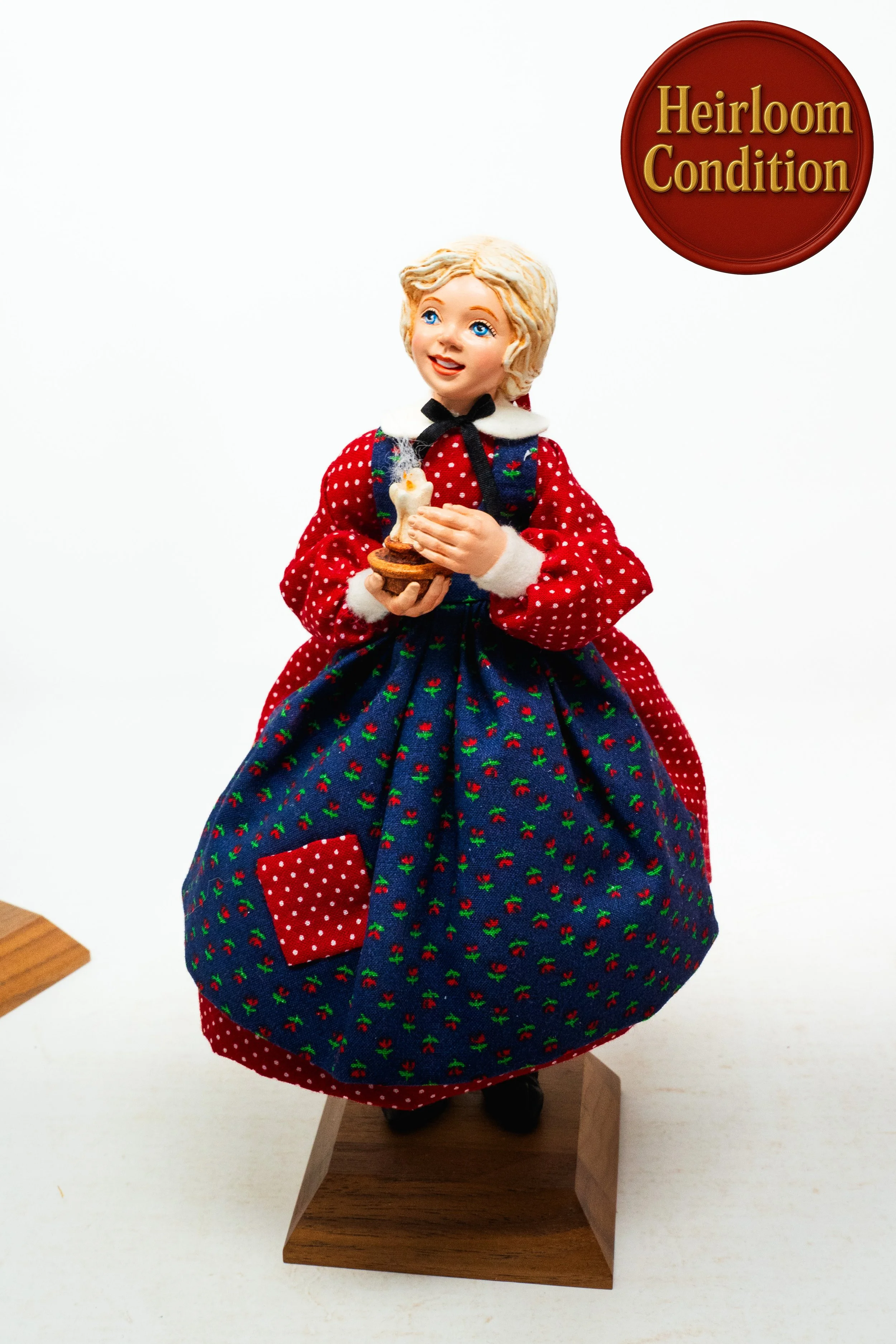 Excellent Condition: Dolls in Excellent condition have weathered years of love well, subtle signs of their often decades of display can be seen as slight fading, minor scuffs on their wooden stands, or tiny paint chips.